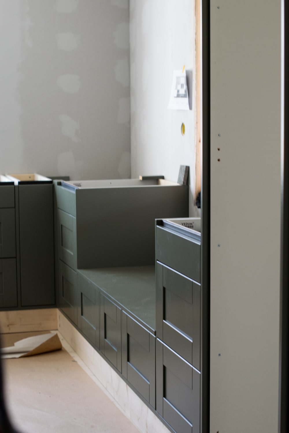 Vi sätter lådor, luckor eller kanske en ugn i ett hörn mellan två skåp.
